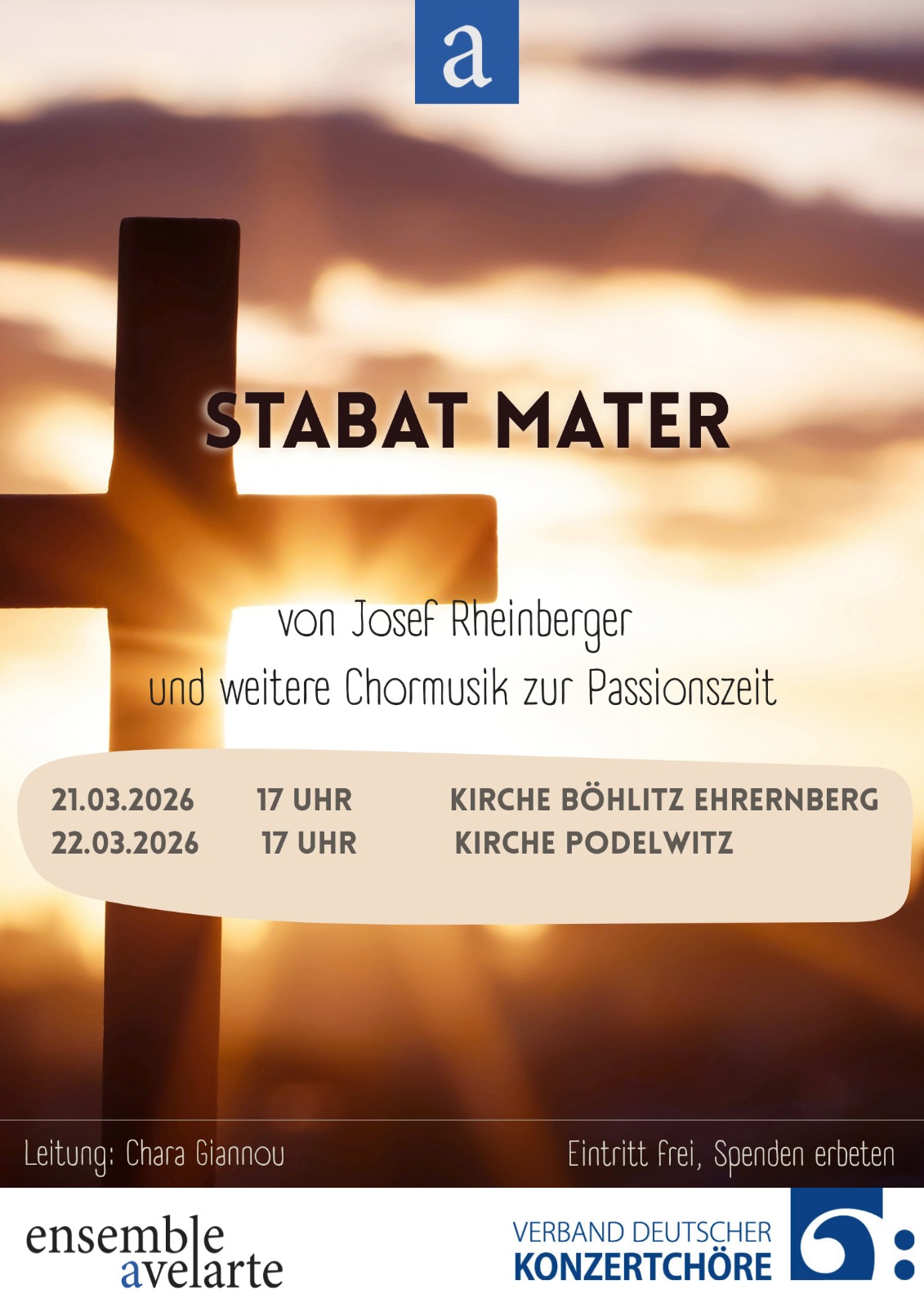 Der Chor präsentiert ein Programm der Passionsmusik mit dem Stabat Mater von Josef Rheinberger als zentralem Werk – eine musikalische Annäherung an den Schmerz der Mutter angesichts des Verlustes. A cappella-Werke rahmen das Programm und schaffen einen Klangraum von Stille, Mitgefühl und innerem Gebet.
